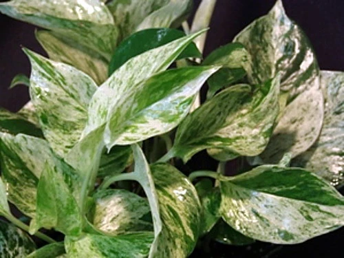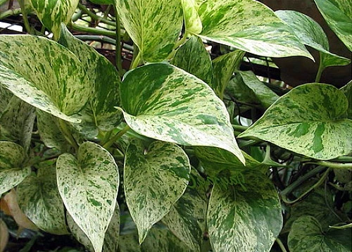 One of the easiest indoor plants to grow. Its trailing stems carry heart-shaped leaves that are irregularly splashed with creamy white, giving them a marbled appearance. The trailing stems can trained to grow up a trellis or planted in a hanging basket.